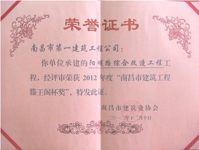 在激烈的市場(chǎng)競(jìng)爭(zhēng)中,我公司本著負(fù)責(zé)任的態(tài)度,嚴(yán)把工程質(zhì)量關(guān),在“陽(yáng)明路綜合改造工程”建設(shè)中榮獲2012年度南昌市建筑業(yè)協(xié)會(huì)頒發(fā)的“南昌市建筑工程滕王閣杯獎(jiǎng)”,同時(shí),梅文華同志獲得“優(yōu)秀項(xiàng)目管理工作者”光榮稱號(hào),為公司贏得了榮譽(yù)。
