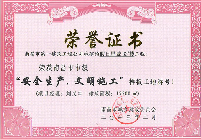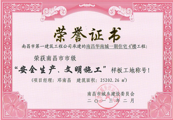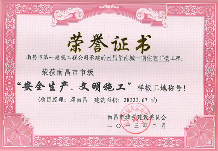 我司承建的“南昌華南城A標(biāo)一期1#、2#、3#、4#、假日星城1#、33#”項目工程喜獲2012年度喜獲“南昌市市級安全生產(chǎn)、文明施工樣板工地”稱號。此2項工程經(jīng)過區(qū)安全監(jiān)督站初審、市安全監(jiān)督站現(xiàn)場檢查、市建委質(zhì)安處復(fù)查、評審委員會評審,并在市安全監(jiān)督站網(wǎng)站進(jìn)行了公示,于2013年2月南昌市建委向我司頒發(fā)了市級樣板工地榮譽(yù)證書。