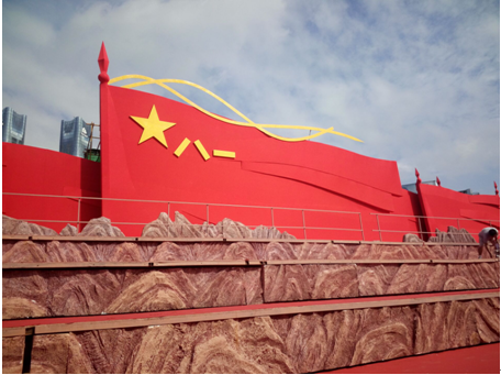 二、 舞臺背景設計具有高大、重疊、立體、斜拼、造型生動等特點,兩側(cè)背景和主背景紅旗場景的制作和安裝是本次施工重點,為了保證施工順利進行、防止發(fā)生安全事故,公司編制了專項施工方案,高大的木質(zhì)背景能屹立在風雨中,最終順利地完成了它的使命,這其中凝聚的是施工管理和技術(shù)人員的智慧以及施工人員的辛勤汗水。