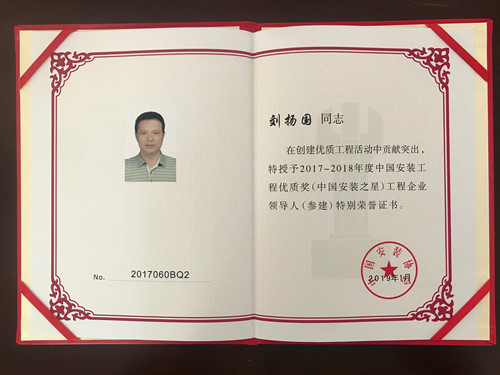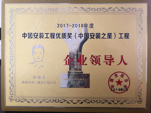 南昌市一建暖通分公司承建的江西綠地國(guó)際會(huì)展中心項(xiàng)目中央空調(diào)小園弧工程,被中國(guó)安裝協(xié)會(huì)評(píng)為第一批2017——2018度中國(guó)安裝工程優(yōu)質(zhì)獎(jiǎng),榮獲“中國(guó)安裝工程優(yōu)質(zhì)獎(jiǎng)(中國(guó)安裝之星)”殊榮,董事長(zhǎng)劉揚(yáng)國(guó)同志被授予企業(yè)領(lǐng)導(dǎo)人(參建)特別榮譽(yù)證書(shū)。