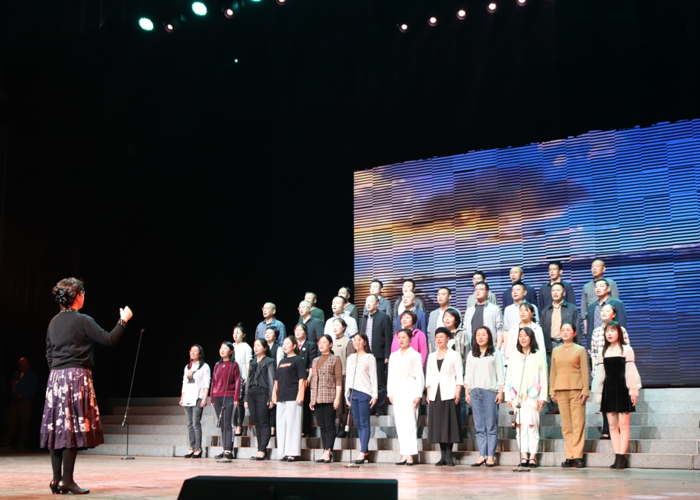 從“請問簡譜是哪一位?”的玩笑話可見組隊(duì)最初有許多人根本不會識譜、不會發(fā)聲、不懂節(jié)奏、音準(zhǔn)一團(tuán)糟到漸漸成型、規(guī)范;由最初的或多或少的抵觸情緒、煩躁、不理解到漸漸自覺投入到合唱訓(xùn)練當(dāng)中來。每周固定的四天,每次不少于三小時,近一個月的排練,每位合唱隊(duì)員放棄了大量的個人休息、娛樂時間。有的因工作忙碌漏掉正常訓(xùn)練,自己就見縫插針看歌譜聽伴奏哼唱來補(bǔ)上;有的嗓子唱啞了就多喝些胖大海,含著潤喉片仔細(xì)聆聽,低聲跟唱……